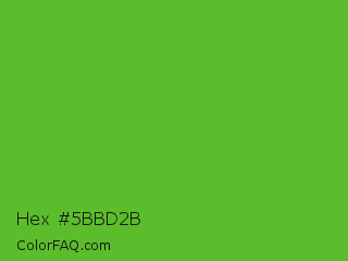 Hex #5bbd2b Color is a normal green color and the nearest color is Green RYB #66b032. Hex code #5bbd2b and RGB value is rgb(91,189,43). In RGB color space, this color is composed of 36% red, 74% green, 17% blue, In CMYK color space, this color is composed of 52% cyan, 0% magenta, 77% yellow , 26% black , In HSL color space, this color has a hue angle of 100° , 63% saturation and 45% lightness.