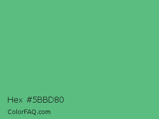 Hex #5bbd80 Color is a normal green color and the nearest color is Emerald #50c878. Hex code #5bbd80 and RGB value is rgb(91,189,128). In RGB color space, this color is composed of 36% red, 74% green, 50% blue, In CMYK color space, this color is composed of 52% cyan, 0% magenta, 32% yellow , 26% black , In HSL color space, this color has a hue angle of 143° , 43% saturation and 55% lightness.