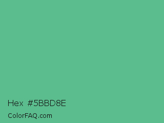 Hex #5bbd8e Color is a normal green color and the nearest color is Silver Tree #66b58f. Hex code #5bbd8e and RGB value is rgb(91,189,142). In RGB color space, this color is composed of 36% red, 74% green, 56% blue, In CMYK color space, this color is composed of 52% cyan, 0% magenta, 25% yellow , 26% black , In HSL color space, this color has a hue angle of 151° , 43% saturation and 55% lightness.