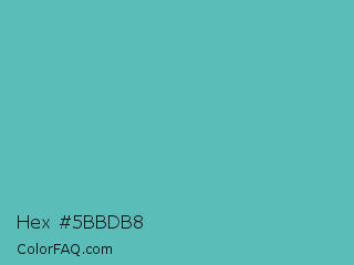 Hex #5bbdb8 Color is a normal cyan color and the nearest color is Fountain Blue #56b4be. Hex code #5bbdb8 and RGB value is rgb(91,189,184). In RGB color space, this color is composed of 36% red, 74% green, 72% blue, In CMYK color space, this color is composed of 52% cyan, 0% magenta, 3% yellow , 26% black , In HSL color space, this color has a hue angle of 177° , 43% saturation and 55% lightness.