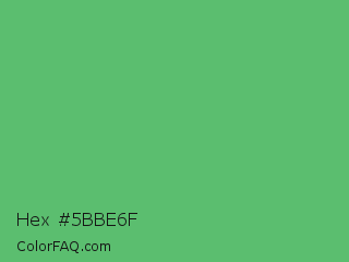 Hex #5bbe6f Color is a normal green color and the nearest color is Fern #63b76c. Hex code #5bbe6f and RGB value is rgb(91,190,111). In RGB color space, this color is composed of 36% red, 75% green, 44% blue, In CMYK color space, this color is composed of 52% cyan, 0% magenta, 42% yellow , 25% black , In HSL color space, this color has a hue angle of 132° , 43% saturation and 55% lightness.