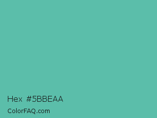 Hex #5bbeaa Color is a normal cyan color and the nearest color is Tradewind #5fb3ac. Hex code #5bbeaa and RGB value is rgb(91,190,170). In RGB color space, this color is composed of 36% red, 75% green, 67% blue, In CMYK color space, this color is composed of 52% cyan, 0% magenta, 11% yellow , 25% black , In HSL color space, this color has a hue angle of 168° , 43% saturation and 55% lightness.