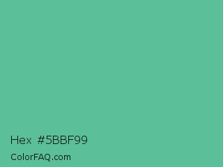 Hex #5bbf99 Color is a normal green color and the nearest color is Silver Tree #66b58f. Hex code #5bbf99 and RGB value is rgb(91,191,153). In RGB color space, this color is composed of 36% red, 75% green, 60% blue, In CMYK color space, this color is composed of 52% cyan, 0% magenta, 20% yellow , 25% black , In HSL color space, this color has a hue angle of 157° , 44% saturation and 55% lightness.