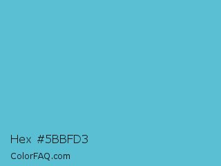 Hex #5bbfd3 Color is a normal cyan color and the nearest color is Viking #64ccdb. Hex code #5bbfd3 and RGB value is rgb(91,191,211). In RGB color space, this color is composed of 36% red, 75% green, 83% blue, In CMYK color space, this color is composed of 57% cyan, 9% magenta, 0% yellow , 17% black , In HSL color space, this color has a hue angle of 190° , 58% saturation and 59% lightness.