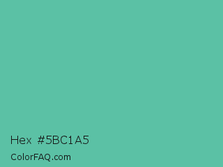 Hex #5bc1a5 Color is a normal cyan color and the nearest color is Tradewind #5fb3ac. Hex code #5bc1a5 and RGB value is rgb(91,193,165). In RGB color space, this color is composed of 36% red, 76% green, 65% blue, In CMYK color space, this color is composed of 53% cyan, 0% magenta, 15% yellow , 24% black , In HSL color space, this color has a hue angle of 164° , 45% saturation and 56% lightness.
