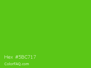 Hex #5bc717 Color is a normal green color and the nearest color is Kelly Green #4cbb17. Hex code #5bc717 and RGB value is rgb(91,199,23). In RGB color space, this color is composed of 36% red, 78% green, 9% blue, In CMYK color space, this color is composed of 54% cyan, 0% magenta, 88% yellow , 22% black , In HSL color space, this color has a hue angle of 97° , 79% saturation and 44% lightness.