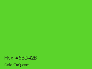 Hex #5bd42b Color is a normal green color and the nearest color is Harlequin Green #46cb18. Hex code #5bd42b and RGB value is rgb(91,212,43). In RGB color space, this color is composed of 36% red, 83% green, 17% blue, In CMYK color space, this color is composed of 57% cyan, 0% magenta, 80% yellow , 17% black , In HSL color space, this color has a hue angle of 103° , 66% saturation and 50% lightness.
