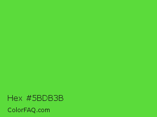 Hex #5bdb3b Color is a normal green color and the nearest color is Harlequin Green #46cb18. Hex code #5bdb3b and RGB value is rgb(91,219,59). In RGB color space, this color is composed of 36% red, 86% green, 23% blue, In CMYK color space, this color is composed of 58% cyan, 0% magenta, 73% yellow , 14% black , In HSL color space, this color has a hue angle of 108° , 69% saturation and 55% lightness.