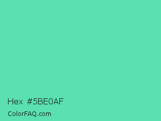 Hex #5be0af Color is a light green color and the nearest color is Medium Aquamarine #66ddaa. Hex code #5be0af and RGB value is rgb(91,224,175). In RGB color space, this color is composed of 36% red, 88% green, 69% blue, In CMYK color space, this color is composed of 59% cyan, 0% magenta, 22% yellow , 12% black , In HSL color space, this color has a hue angle of 158° , 68% saturation and 62% lightness.