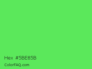 Hex #5be85b Color is a light green color and the nearest color is Screamin Green #66ff66. Hex code #5be85b and RGB value is rgb(91,232,91). In RGB color space, this color is composed of 36% red, 91% green, 36% blue, In CMYK color space, this color is composed of 61% cyan, 0% magenta, 61% yellow , 9% black , In HSL color space, this color has a hue angle of 120° , 75% saturation and 63% lightness.