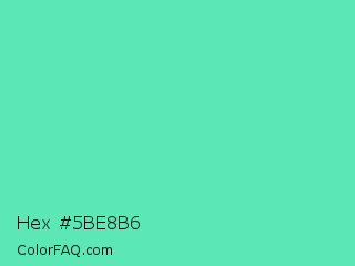 Hex #5be8b6 Color is a light green color and the nearest color is Medium Aquamarine #66ddaa. Hex code #5be8b6 and RGB value is rgb(91,232,182). In RGB color space, this color is composed of 36% red, 91% green, 71% blue, In CMYK color space, this color is composed of 61% cyan, 0% magenta, 22% yellow , 9% black , In HSL color space, this color has a hue angle of 159° , 75% saturation and 63% lightness.