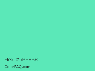 Hex #5be8b8 Color is a light green color and the nearest color is Medium Aquamarine #66ddaa. Hex code #5be8b8 and RGB value is rgb(91,232,184). In RGB color space, this color is composed of 36% red, 91% green, 72% blue, In CMYK color space, this color is composed of 61% cyan, 0% magenta, 21% yellow , 9% black , In HSL color space, this color has a hue angle of 160° , 75% saturation and 63% lightness.