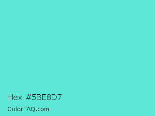 Hex #5be8d7 Color is a light cyan color and the nearest color is Turquoise Blue #6cdae7. Hex code #5be8d7 and RGB value is rgb(91,232,215). In RGB color space, this color is composed of 36% red, 91% green, 84% blue, In CMYK color space, this color is composed of 61% cyan, 0% magenta, 7% yellow , 9% black , In HSL color space, this color has a hue angle of 173° , 75% saturation and 63% lightness.