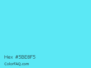 Hex #5be8f5 Color is a light cyan color and the nearest color is Turquoise Blue #6cdae7. Hex code #5be8f5 and RGB value is rgb(91,232,245). In RGB color space, this color is composed of 36% red, 91% green, 96% blue, In CMYK color space, this color is composed of 63% cyan, 5% magenta, 0% yellow , 4% black , In HSL color space, this color has a hue angle of 185° , 89% saturation and 66% lightness.