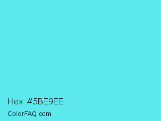 Hex #5be9ee Color is a light cyan color and the nearest color is Turquoise Blue #6cdae7. Hex code #5be9ee and RGB value is rgb(91,233,238). In RGB color space, this color is composed of 36% red, 91% green, 93% blue, In CMYK color space, this color is composed of 62% cyan, 2% magenta, 0% yellow , 7% black , In HSL color space, this color has a hue angle of 182° , 81% saturation and 65% lightness.