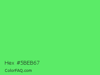 Hex #5beb67 Color is a light green color and the nearest color is Screamin Green #66ff66. Hex code #5beb67 and RGB value is rgb(91,235,103). In RGB color space, this color is composed of 36% red, 92% green, 40% blue, In CMYK color space, this color is composed of 61% cyan, 0% magenta, 56% yellow , 8% black , In HSL color space, this color has a hue angle of 125° , 78% saturation and 64% lightness.
