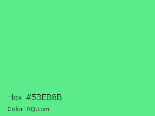 Hex #5beb8b Color is a light green color and the nearest color is Very Light Malachite Green #64e986. Hex code #5beb8b and RGB value is rgb(91,235,139). In RGB color space, this color is composed of 36% red, 92% green, 55% blue, In CMYK color space, this color is composed of 61% cyan, 0% magenta, 41% yellow , 8% black , In HSL color space, this color has a hue angle of 140° , 78% saturation and 64% lightness.