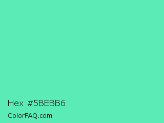 Hex #5bebb6 Color is a light green color and the nearest color is Medium Aquamarine #66ddaa. Hex code #5bebb6 and RGB value is rgb(91,235,182). In RGB color space, this color is composed of 36% red, 92% green, 71% blue, In CMYK color space, this color is composed of 61% cyan, 0% magenta, 23% yellow , 8% black , In HSL color space, this color has a hue angle of 158° , 78% saturation and 64% lightness.