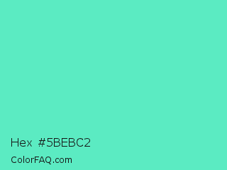 Hex #5bebc2 Color is a light green color and the nearest color is Medium Aquamarine #66ddaa. Hex code #5bebc2 and RGB value is rgb(91,235,194). In RGB color space, this color is composed of 36% red, 92% green, 76% blue, In CMYK color space, this color is composed of 61% cyan, 0% magenta, 17% yellow , 8% black , In HSL color space, this color has a hue angle of 163° , 78% saturation and 64% lightness.