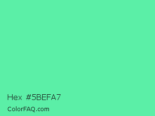 Hex #5befa7 Color is a light green color and the nearest color is Medium Aquamarine #66ddaa. Hex code #5befa7 and RGB value is rgb(91,239,167). In RGB color space, this color is composed of 36% red, 94% green, 65% blue, In CMYK color space, this color is composed of 62% cyan, 0% magenta, 30% yellow , 6% black , In HSL color space, this color has a hue angle of 151° , 82% saturation and 65% lightness.