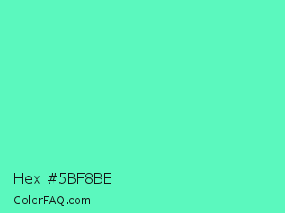 Hex #5bf8be Color is a light green color and the nearest color is Medium Aquamarine #66ddaa. Hex code #5bf8be and RGB value is rgb(91,248,190). In RGB color space, this color is composed of 36% red, 97% green, 75% blue, In CMYK color space, this color is composed of 63% cyan, 0% magenta, 23% yellow , 3% black , In HSL color space, this color has a hue angle of 158° , 92% saturation and 66% lightness.