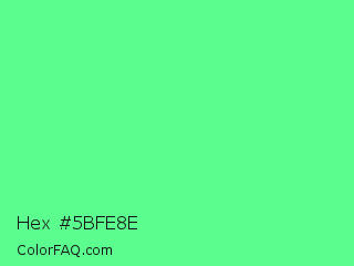Hex #5bfe8e Color is a light green color and the nearest color is Very Light Malachite Green #64e986. Hex code #5bfe8e and RGB value is rgb(91,254,142). In RGB color space, this color is composed of 36% red, 100% green, 56% blue, In CMYK color space, this color is composed of 64% cyan, 0% magenta, 44% yellow , 0% black , In HSL color space, this color has a hue angle of 139° , 99% saturation and 68% lightness.