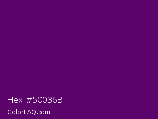 Hex #5c036b Color is a very dark purple color and the nearest color is Honey Flower #4f1c70. Hex code #5c036b and RGB value is rgb(92,3,107). In RGB color space, this color is composed of 36% red, 1% green, 42% blue, In CMYK color space, this color is composed of 14% cyan, 97% magenta, 0% yellow , 58% black , In HSL color space, this color has a hue angle of 291° , 95% saturation and 22% lightness.