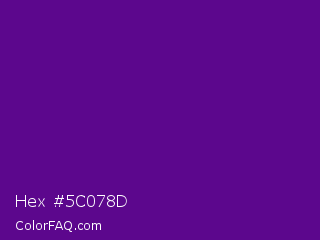 Hex #5c078d Color is a dark purple color and the nearest color is Purple #660099. Hex code #5c078d and RGB value is rgb(92,7,141). In RGB color space, this color is composed of 36% red, 3% green, 55% blue, In CMYK color space, this color is composed of 35% cyan, 95% magenta, 0% yellow , 45% black , In HSL color space, this color has a hue angle of 278° , 91% saturation and 29% lightness.