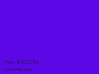 Hex #5c07e6 Color is a normal violet color and the nearest color is Han Purple #5218fa. Hex code #5c07e6 and RGB value is rgb(92,7,230). In RGB color space, this color is composed of 36% red, 3% green, 90% blue, In CMYK color space, this color is composed of 60% cyan, 97% magenta, 0% yellow , 10% black , In HSL color space, this color has a hue angle of 263° , 94% saturation and 46% lightness.