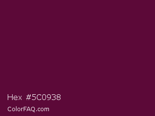 Hex #5c0938 Color is a very dark magenta color and the nearest color is Mulberry Wood #5c0536. Hex code #5c0938 and RGB value is rgb(92,9,56). In RGB color space, this color is composed of 36% red, 4% green, 22% blue, In CMYK color space, this color is composed of 0% cyan, 90% magenta, 39% yellow , 64% black , In HSL color space, this color has a hue angle of 326° , 82% saturation and 20% lightness.