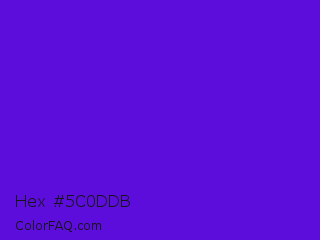 Hex #5c0ddb Color is a normal violet color and the nearest color is Han Purple #5218fa. Hex code #5c0ddb and RGB value is rgb(92,13,219). In RGB color space, this color is composed of 36% red, 5% green, 86% blue, In CMYK color space, this color is composed of 58% cyan, 94% magenta, 0% yellow , 14% black , In HSL color space, this color has a hue angle of 263° , 89% saturation and 45% lightness.