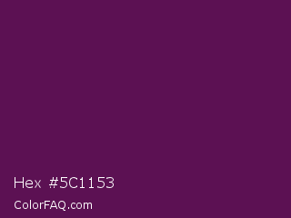 Hex #5c1153 Color is a very dark magenta color and the nearest color is Clairvoyant #480656. Hex code #5c1153 and RGB value is rgb(92,17,83). In RGB color space, this color is composed of 36% red, 7% green, 33% blue, In CMYK color space, this color is composed of 0% cyan, 82% magenta, 10% yellow , 64% black , In HSL color space, this color has a hue angle of 307° , 69% saturation and 21% lightness.