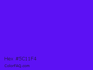 Hex #5c11f4 Color is a normal indigo color and the nearest color is Han Purple #5218fa. Hex code #5c11f4 and RGB value is rgb(92,17,244). In RGB color space, this color is composed of 36% red, 7% green, 96% blue, In CMYK color space, this color is composed of 62% cyan, 93% magenta, 0% yellow , 4% black , In HSL color space, this color has a hue angle of 260° , 91% saturation and 51% lightness.