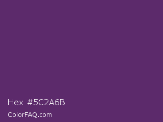 Hex #5c2a6b Color is a dark purple color and the nearest color is Imperial #602f6b. Hex code #5c2a6b and RGB value is rgb(92,42,107). In RGB color space, this color is composed of 36% red, 16% green, 42% blue, In CMYK color space, this color is composed of 14% cyan, 61% magenta, 0% yellow , 58% black , In HSL color space, this color has a hue angle of 286° , 44% saturation and 29% lightness.