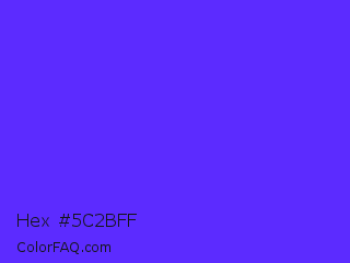 Hex #5c2bff Color is a normal indigo color and the nearest color is Han Purple #5218fa. Hex code #5c2bff and RGB value is rgb(92,43,255). In RGB color space, this color is composed of 36% red, 17% green, 100% blue, In CMYK color space, this color is composed of 64% cyan, 83% magenta, 0% yellow , 0% black , In HSL color space, this color has a hue angle of 254° , 100% saturation and 58% lightness.