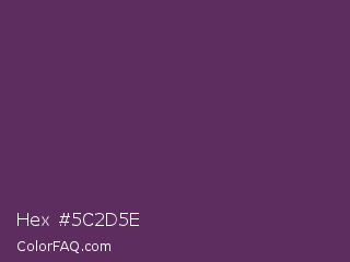 Hex #5c2d5e Color is a dark magenta color and the nearest color is Japanese Violet #5b3256. Hex code #5c2d5e and RGB value is rgb(92,45,94). In RGB color space, this color is composed of 36% red, 18% green, 37% blue, In CMYK color space, this color is composed of 2% cyan, 52% magenta, 0% yellow , 63% black , In HSL color space, this color has a hue angle of 298° , 35% saturation and 27% lightness.