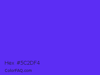 Hex #5c2df4 Color is a normal indigo color and the nearest color is Han Purple #5218fa. Hex code #5c2df4 and RGB value is rgb(92,45,244). In RGB color space, this color is composed of 36% red, 18% green, 96% blue, In CMYK color space, this color is composed of 62% cyan, 82% magenta, 0% yellow , 4% black , In HSL color space, this color has a hue angle of 254° , 90% saturation and 57% lightness.