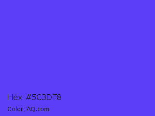 Hex #5c3df8 Color is a light indigo color and the nearest color is Majorelle Blue #6050dc. Hex code #5c3df8 and RGB value is rgb(92,61,248). In RGB color space, this color is composed of 36% red, 24% green, 97% blue, In CMYK color space, this color is composed of 63% cyan, 75% magenta, 0% yellow , 3% black , In HSL color space, this color has a hue angle of 250° , 93% saturation and 61% lightness.