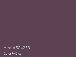 Hex #5c4253 Color is a normal magenta color and the nearest color is Eggplant #614051. Hex code #5c4253 and RGB value is rgb(92,66,83). In RGB color space, this color is composed of 36% red, 26% green, 33% blue, In CMYK color space, this color is composed of 0% cyan, 28% magenta, 10% yellow , 64% black , In HSL color space, this color has a hue angle of 321° , 16% saturation and 31% lightness.