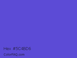Hex #5c4bd6 Color is a normal indigo color and the nearest color is Iris #5a4fcf. Hex code #5c4bd6 and RGB value is rgb(92,75,214). In RGB color space, this color is composed of 36% red, 29% green, 84% blue, In CMYK color space, this color is composed of 57% cyan, 65% magenta, 0% yellow , 16% black , In HSL color space, this color has a hue angle of 247° , 63% saturation and 57% lightness.