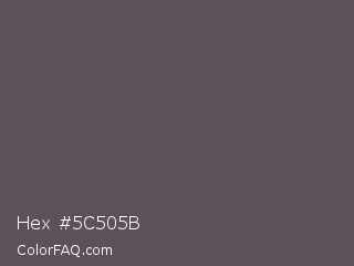 Hex #5c505b Color is a normal magenta color and the nearest color is Scarpa Flow #585562. Hex code #5c505b and RGB value is rgb(92,80,91). In RGB color space, this color is composed of 36% red, 31% green, 36% blue, In CMYK color space, this color is composed of 0% cyan, 13% magenta, 1% yellow , 64% black , In HSL color space, this color has a hue angle of 305° , 7% saturation and 34% lightness.