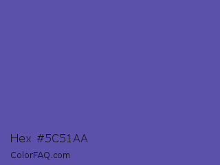Hex #5c51aa Color is a normal indigo color and the nearest color is Liberty #545aa7. Hex code #5c51aa and RGB value is rgb(92,81,170). In RGB color space, this color is composed of 36% red, 32% green, 67% blue, In CMYK color space, this color is composed of 46% cyan, 52% magenta, 0% yellow , 33% black , In HSL color space, this color has a hue angle of 247° , 35% saturation and 49% lightness.