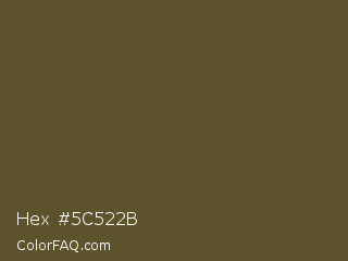 Hex #5c522b Color is a dark yellow color and the nearest color is Donkey Brown #664c28. Hex code #5c522b and RGB value is rgb(92,82,43). In RGB color space, this color is composed of 36% red, 32% green, 17% blue, In CMYK color space, this color is composed of 0% cyan, 11% magenta, 53% yellow , 64% black , In HSL color space, this color has a hue angle of 48° , 36% saturation and 26% lightness.