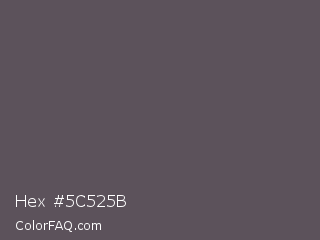 Hex #5c525b Color is a normal magenta color and the nearest color is Scarpa Flow #585562. Hex code #5c525b and RGB value is rgb(92,82,91). In RGB color space, this color is composed of 36% red, 32% green, 36% blue, In CMYK color space, this color is composed of 0% cyan, 11% magenta, 1% yellow , 64% black , In HSL color space, this color has a hue angle of 306° , 6% saturation and 34% lightness.