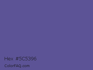 Hex #5c5396 Color is a normal indigo color and the nearest color is Butterfly Bush #624e9a. Hex code #5c5396 and RGB value is rgb(92,83,150). In RGB color space, this color is composed of 36% red, 33% green, 59% blue, In CMYK color space, this color is composed of 39% cyan, 45% magenta, 0% yellow , 41% black , In HSL color space, this color has a hue angle of 248° , 29% saturation and 46% lightness.
