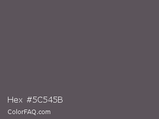 Hex #5c545b Color is a normal magenta color and the nearest color is Scarpa Flow #585562. Hex code #5c545b and RGB value is rgb(92,84,91). In RGB color space, this color is composed of 36% red, 33% green, 36% blue, In CMYK color space, this color is composed of 0% cyan, 9% magenta, 1% yellow , 64% black , In HSL color space, this color has a hue angle of 308° , 5% saturation and 35% lightness.