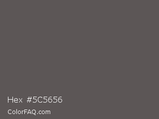 Hex #5c5656 Color is a normal red color and the nearest color is Chicago #5d5c58. Hex code #5c5656 and RGB value is rgb(92,86,86). In RGB color space, this color is composed of 36% red, 34% green, 34% blue, In CMYK color space, this color is composed of 0% cyan, 7% magenta, 7% yellow , 64% black , In HSL color space, this color has a hue angle of 0° , 3% saturation and 35% lightness.