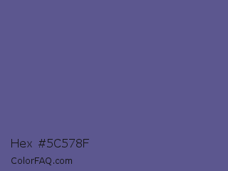 Hex #5c578f Color is a normal indigo color and the nearest color is Butterfly Bush #624e9a. Hex code #5c578f and RGB value is rgb(92,87,143). In RGB color space, this color is composed of 36% red, 34% green, 56% blue, In CMYK color space, this color is composed of 36% cyan, 39% magenta, 0% yellow , 44% black , In HSL color space, this color has a hue angle of 245° , 24% saturation and 45% lightness.