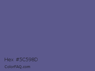 Hex #5c598d Color is a normal indigo color and the nearest color is Butterfly Bush #624e9a. Hex code #5c598d and RGB value is rgb(92,89,141). In RGB color space, this color is composed of 36% red, 35% green, 55% blue, In CMYK color space, this color is composed of 35% cyan, 37% magenta, 0% yellow , 45% black , In HSL color space, this color has a hue angle of 243° , 23% saturation and 45% lightness.