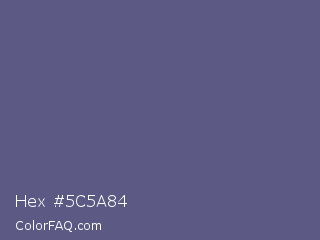 Hex #5c5a84 Color is a normal indigo color and the nearest color is Comet #5c5d75. Hex code #5c5a84 and RGB value is rgb(92,90,132). In RGB color space, this color is composed of 36% red, 35% green, 52% blue, In CMYK color space, this color is composed of 30% cyan, 32% magenta, 0% yellow , 48% black , In HSL color space, this color has a hue angle of 243° , 19% saturation and 44% lightness.